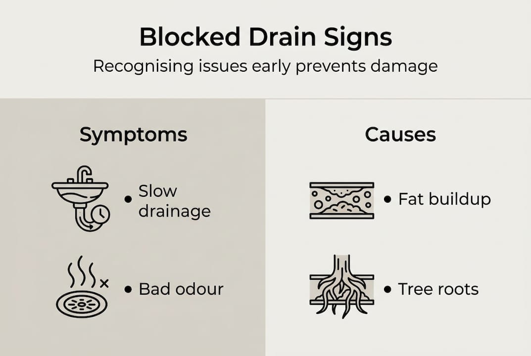 | Common symptoms | Recognising slow drainage, unpleasant odours, gurgling noises and water backing up helps identify the likely blockage and its urgency. |