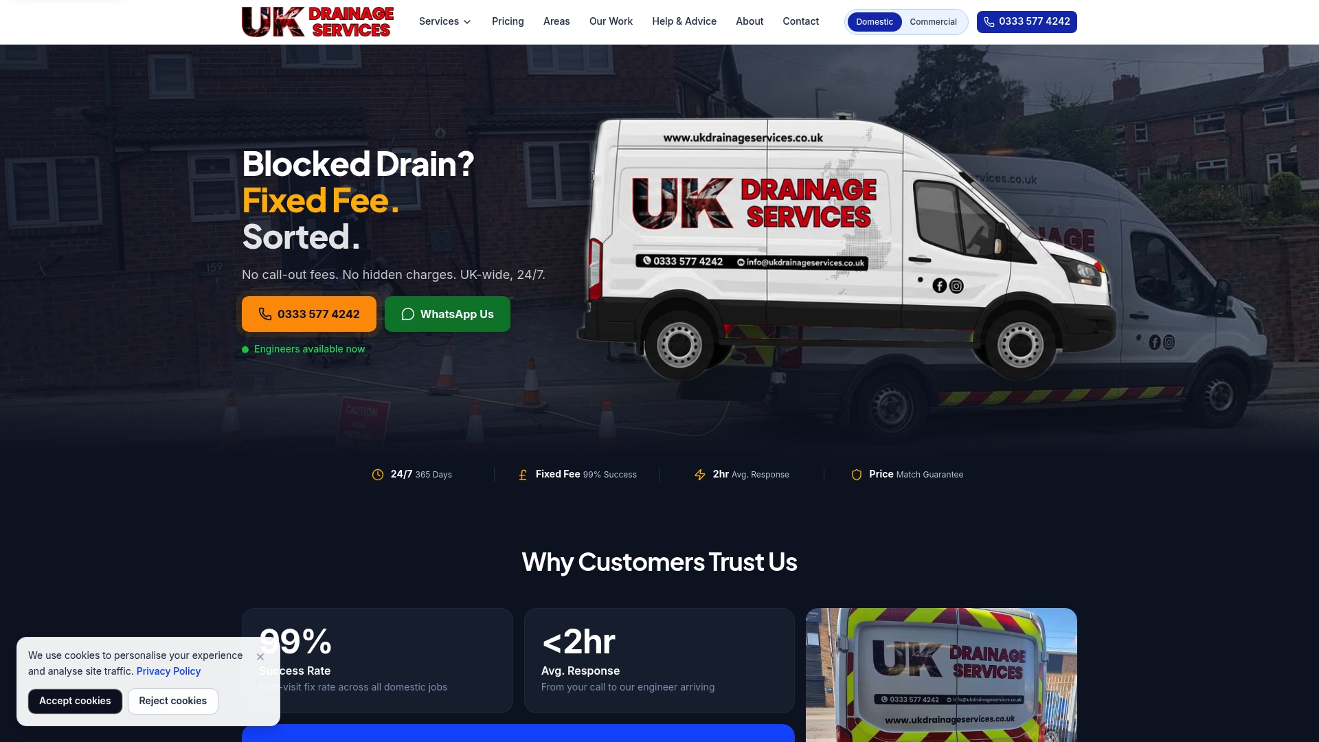UK Drainage Services offers a straightforward, fixed fee pricing model and claims a 99% success rate for unblocking jobs. Their 24/7 availability and an average response time of two hours make them a reliable option for urgent household drainage problems.